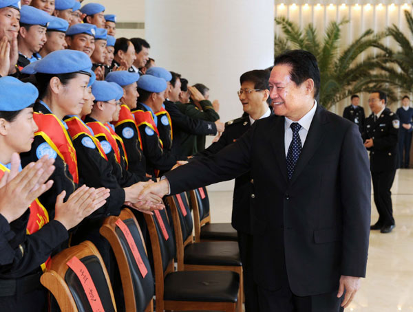 "In the face of the sudden earthquake, tough environments and dangerous missions, you finished all duties for peacekeeping and quake relief fearlessly and brilliantly," said Zhou, member of the Standing Committee of the Political Bureau of the Communist Party of China Central Committee, as he met with all 126 members of the team. He extended his respect to all Chinese peacekeeping police. Zhou said the team had won high praises from the United Nations and the government and people of Haiti. "Meanwhile, we will never forget the eight peacekeeping heroes who died during the quake," he said. The Haiti government estimated the 7.0 magnitude earthquake killed more than 200,000 people, injured and permanently disabled many thousands and left 1.5 million people homeless. |