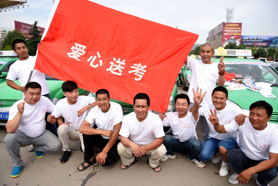![]() Drivers and volunteers participate in the launch ceremony for the escort service for students who will take part in the upcoming 2015 National College Entrance Examination, or Gaokao. The launch ceremony kicks off at the railway station square of Haozhou, east China's Anhui Province on June 4, 2015. More than 300 taxi drivers and private car drivers will provide escort services and take students to their examination sites on time for free. [Photo: CFP]