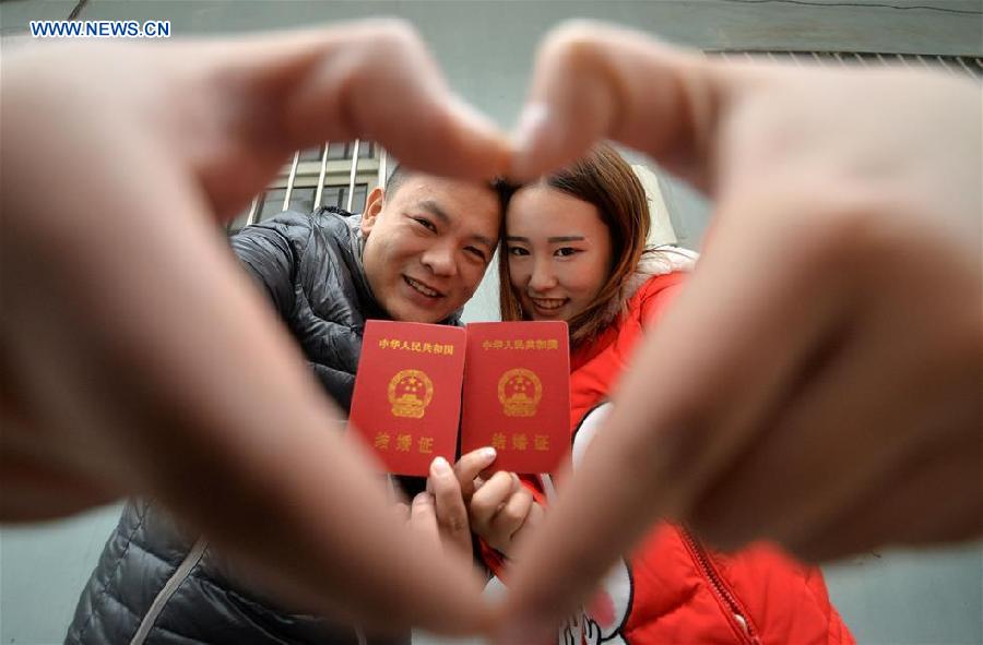 ![]() A couple pose for pictures after registering for marriage at a marriage registration office in Handan, north China's Hebei Province, Nov. 11, 2015, or the "Singles Day" called by many netizens and young people. Many young people chose to register for marriage on the "Singles Day" to bid farewell to their bachelorhood. (Xinhua/Hao Qunying)