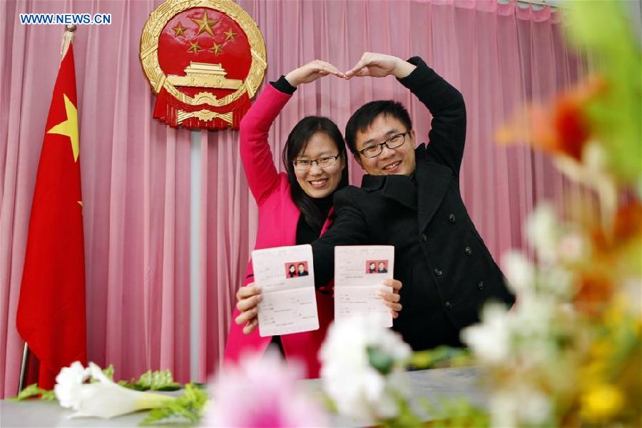 ![]() A couple pose for pictures after registering for marriage at a marriage registration office in Lianyungang, east China's Jiangsu Province, Nov. 11, 2015, or the "Singles Day" called by many netizens and young people. Many young people chose to register for marriage on the "Singles Day" to bid farewell to their bachelorhood. (Xinhua/Si Wei)