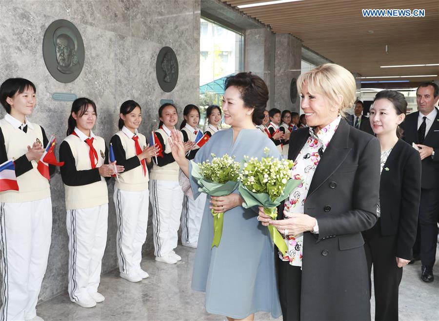Peng Liyuan, wife of Chinese President Xi Jinping, and Brigitte Macron, wife of French President Emmanuel Macron, visit the Shanghai Foreign Language School affiliated to Shanghai International Studies University in Shanghai, east China, Nov. 5, 2019. Peng Liyuan invited Brigitte Macron to visit the middle school on Tuesday. (Xinhua/Ding Lin)