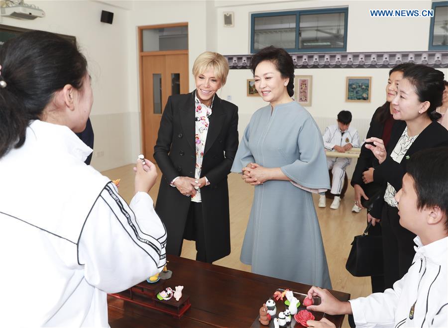 Peng Liyuan, wife of Chinese President Xi Jinping, and Brigitte Macron, wife of French President Emmanuel Macron, watch as students learn to make dough sculptures during a class of traditional handicrafts at the Shanghai Foreign Language School affiliated to Shanghai International Studies University in Shanghai, east China, Nov. 5, 2019. Peng Liyuan invited Brigitte Macron to visit the middle school on Tuesday. (Xinhua/Ding Lin)