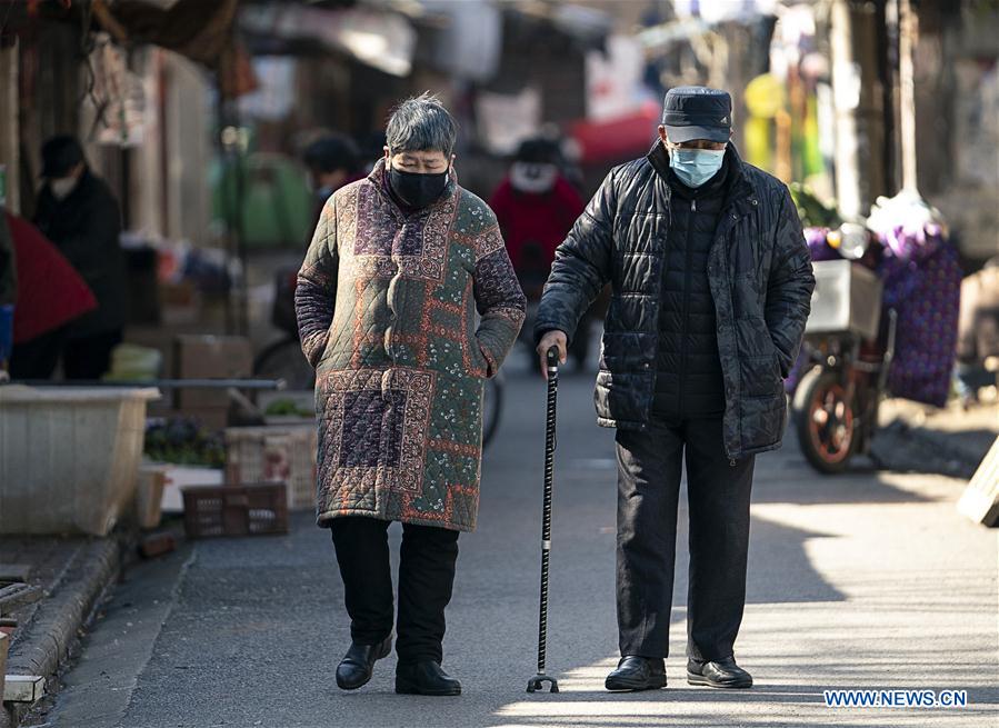People take a walk in a street in Wuhan, central China's Hubei Province, Feb. 16, 2020. Wuhan welcomed a sunny day on Sunday. (Xinhua/Xiong Qi)