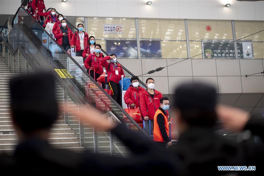 Two policemen salute to medical staff from Hunan at Wuhan Railway Station in Wuhan City, central China's Hubei Province, March 22, 2020. Nearly 600 medical workers from Hunan Province left Wuhan on Sunday after finishing their tasks in Huanggang City of Hubei. (Xinhua/Xiong Qi)