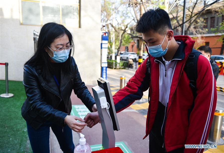 A student gets his body temperature checked before entering the campus at a middle school in Taiyuan, north China's Shanxi Province, April 25, 2020. Students in their final year of junior high school returned to school in Taiyuan on Saturday. (Photo by Chai Ting/Xinhua)