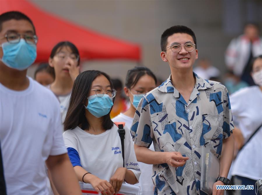 Examinees walk out of an exam site in Hohhot, north China's Inner Mongolia Autonomous Region, July 8, 2020. The national college entrance exam concluded in some parts of China on Wednesday. (Xinhua/Xu Qin)