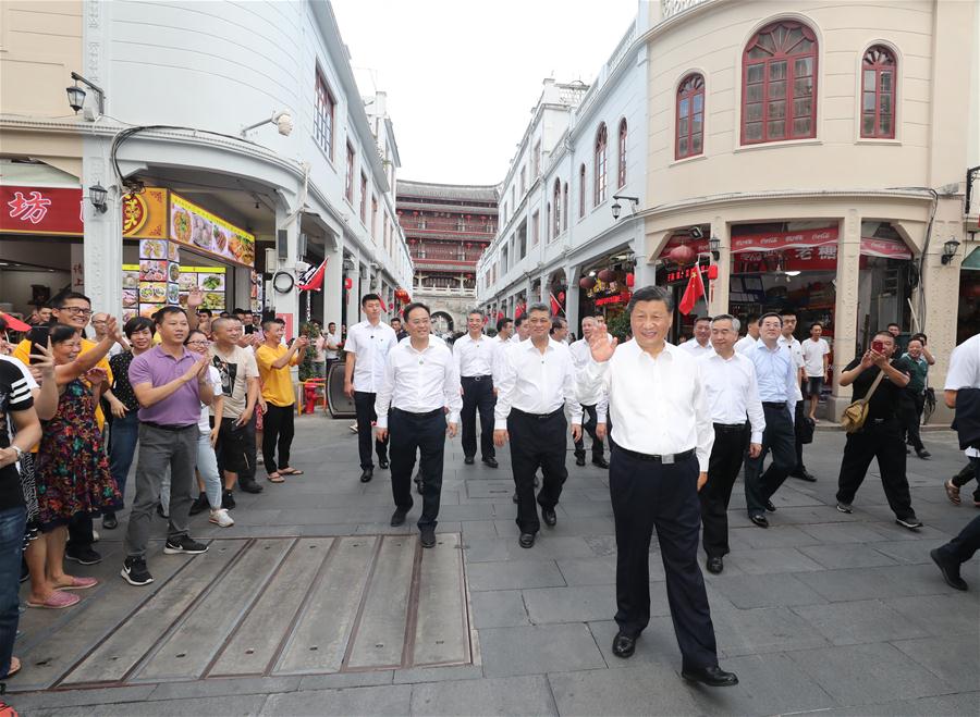 Chinese President Xi Jinping, also general secretary of the Communist Party of China Central Committee and chairman of the Central Military Commission, waves to people while visiting a street lined with ancient memorial archways in Chaozhou, south China's Guangdong Province, Oct. 12, 2020. Xi on Monday arrived in Guangdong to begin an inspection tour of the province. (Xinhua/Wang Ye)