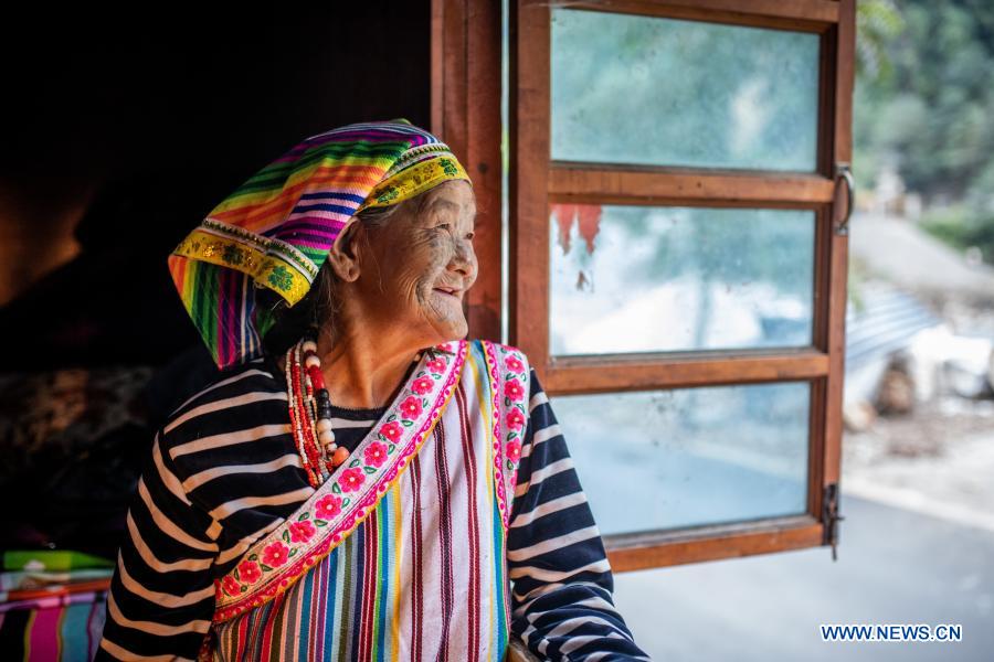 Dulong resident Li Wenshi, wearing a traditional face tattoo, takes a rest in Dulongjiang Township of Gongshan Dulong and Nu Autonomous County, southwest China's Yunnan Province, Oct. 27, 2020. Dulong is a mountain-dwelling ethnic group in southwest China. It is one of the least populous of China's 56 minority nationalities. It is also called a "direct-transition" minority ethnic group because the Dulong people didn't bid farewell to primitive life until the founding of the People's Republic of China in 1949 and since then they directly stepped into the socialist society. Most Dulong people live in Dulongjiang Township, where an inhospitable mountainous terrain had been thwarting the town's development for decades. Thus, the township had been one of the poorest area in Yunnan Province and even in the entire country. But the local economic and social development has been fast-tracked in recent years when many difficulties that bottlenecked the development were eliminated thanks to state and provincial efforts. For example, the town built better infrastructure, developed specialized industries and enrolled high-quality talents. In 2018, the Dulong ethnic group shook off poverty as a whole, a phenomenal breakthrough. Nowadays, all of the 1,100-plus households in Dulongjiang have moved into new, better residences. Many residents are now engaged in herbal planting and poultry husbandry with local characteristics. All of the six administrative villages have access to roads with hard surfaces and signals of radio and TV, and are all covered by the 4G network. All villagers benefit from a critical illness insurance program. Meanwhile, the youngsters are entitled to 14 years of free education which lasts from pre-school classes to high school education. The rate of primary school attendance and that of enrollment into schools for higher levels have both remained 100 percent. Nowadays, Dulongjiang is no longer the isolated, conservative and backward region it used to be. The Dulong people here are embracing modern life at a faster pace and are keeping pace with the outside world. (Xinhua/Hu Chao)
