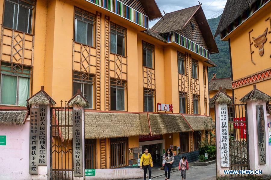Photo taken on Oct. 31, 2020 shows a township-level hospital in Dulongjiang Township of Gongshan Dulong and Nu Autonomous County, southwest China's Yunnan Province. Dulong is a mountain-dwelling ethnic group in southwest China. It is one of the least populous of China's 56 minority nationalities. It is also called a "direct-transition" minority ethnic group because the Dulong people didn't bid farewell to primitive life until the founding of the People's Republic of China in 1949 and since then they directly stepped into the socialist society. Most Dulong people live in Dulongjiang Township, where an inhospitable mountainous terrain had been thwarting the town's development for decades. Thus, the township had been one of the poorest area in Yunnan Province and even in the entire country. But the local economic and social development has been fast-tracked in recent years when many difficulties that bottlenecked the development were eliminated thanks to state and provincial efforts. For example, the town built better infrastructure, developed specialized industries and enrolled high-quality talents. In 2018, the Dulong ethnic group shook off poverty as a whole, a phenomenal breakthrough. Nowadays, all of the 1,100-plus households in Dulongjiang have moved into new, better residences. Many residents are now engaged in herbal planting and poultry husbandry with local characteristics. All of the six administrative villages have access to roads with hard surfaces and signals of radio and TV, and are all covered by the 4G network. All villagers benefit from a critical illness insurance program. Meanwhile, the youngsters are entitled to 14 years of free education which lasts from pre-school classes to high school education. The rate of primary school attendance and that of enrollment into schools for higher levels have both remained 100 percent. Nowadays, Dulongjiang is no longer the isolated, conservative and backward region it used to be. The Dulong people here are embracing modern life at a faster pace and are keeping pace with the outside world. (Xinhua/Hu Chao)