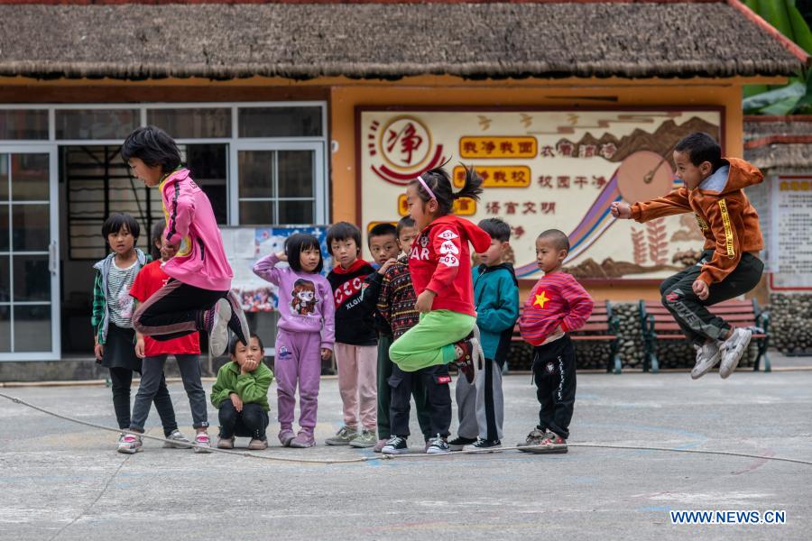 Dulong students play rope jumping at Dulongjiang Nine-Year Comprehensive School in Dulongjiang Township of Gongshan Dulong and Nu Autonomous County, southwest China's Yunnan Province, Oct. 31, 2020. Dulong is a mountain-dwelling ethnic group in southwest China. It is one of the least populous of China's 56 minority nationalities. It is also called a "direct-transition" minority ethnic group because the Dulong people didn't bid farewell to primitive life until the founding of the People's Republic of China in 1949 and since then they directly stepped into the socialist society. Most Dulong people live in Dulongjiang Township, where an inhospitable mountainous terrain had been thwarting the town's development for decades. Thus, the township had been one of the poorest area in Yunnan Province and even in the entire country. But the local economic and social development has been fast-tracked in recent years when many difficulties that bottlenecked the development were eliminated thanks to state and provincial efforts. For example, the town built better infrastructure, developed specialized industries and enrolled high-quality talents. In 2018, the Dulong ethnic group shook off poverty as a whole, a phenomenal breakthrough. Nowadays, all of the 1,100-plus households in Dulongjiang have moved into new, better residences. Many residents are now engaged in herbal planting and poultry husbandry with local characteristics. All of the six administrative villages have access to roads with hard surfaces and signals of radio and TV, and are all covered by the 4G network. All villagers benefit from a critical illness insurance program. Meanwhile, the youngsters are entitled to 14 years of free education which lasts from pre-school classes to high school education. The rate of primary school attendance and that of enrollment into schools for higher levels have both remained 100 percent. Nowadays, Dulongjiang is no longer the isolated, conservative and backward region it used to be. The Dulong people here are embracing modern life at a faster pace and are keeping pace with the outside world. (Xinhua/Hu Chao)