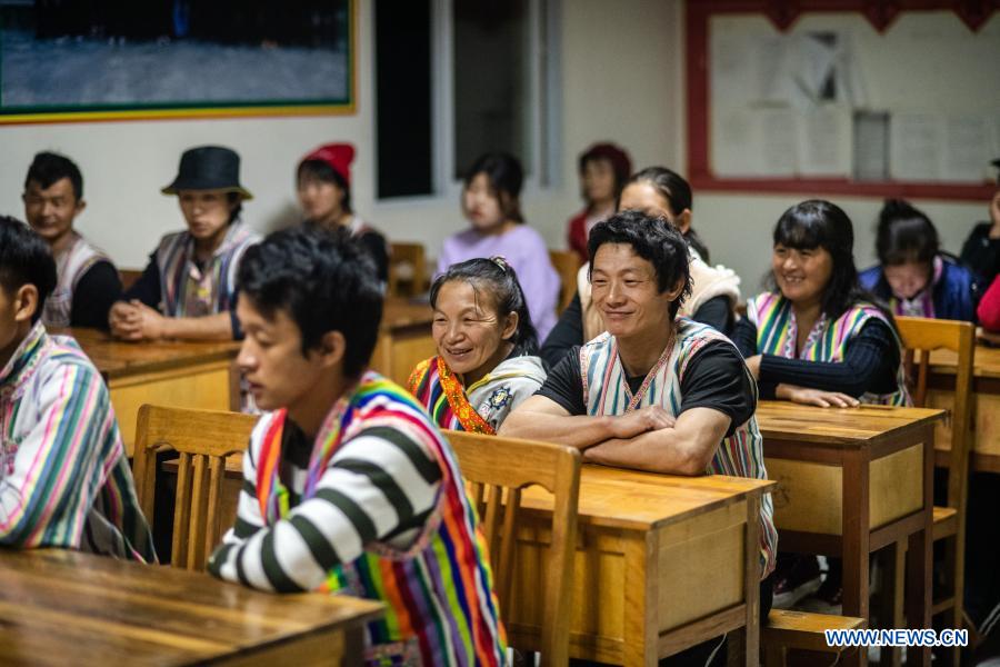 Dulong villagers attend an evening lesson in Kongdang Village of Dulongjiang Township, Gongshan Dulong and Nu Autonomous County, southwest China's Yunnan Province, Oct. 28, 2020. Dulong is a mountain-dwelling ethnic group in southwest China. It is one of the least populous of China's 56 minority nationalities. It is also called a "direct-transition" minority ethnic group because the Dulong people didn't bid farewell to primitive life until the founding of the People's Republic of China in 1949 and since then they directly stepped into the socialist society. Most Dulong people live in Dulongjiang Township, where an inhospitable mountainous terrain had been thwarting the town's development for decades. Thus, the township had been one of the poorest area in Yunnan Province and even in the entire country. But the local economic and social development has been fast-tracked in recent years when many difficulties that bottlenecked the development were eliminated thanks to state and provincial efforts. For example, the town built better infrastructure, developed specialized industries and enrolled high-quality talents. In 2018, the Dulong ethnic group shook off poverty as a whole, a phenomenal breakthrough. Nowadays, all of the 1,100-plus households in Dulongjiang have moved into new, better residences. Many residents are now engaged in herbal planting and poultry husbandry with local characteristics. All of the six administrative villages have access to roads with hard surfaces and signals of radio and TV, and are all covered by the 4G network. All villagers benefit from a critical illness insurance program. Meanwhile, the youngsters are entitled to 14 years of free education which lasts from pre-school classes to high school education. The rate of primary school attendance and that of enrollment into schools for higher levels have both remained 100 percent. Nowadays, Dulongjiang is no longer the isolated, conservative and backward region it used to be. The Dulong people here are embracing modern life at a faster pace and are keeping pace with the outside world. (Xinhua/Hu Chao)