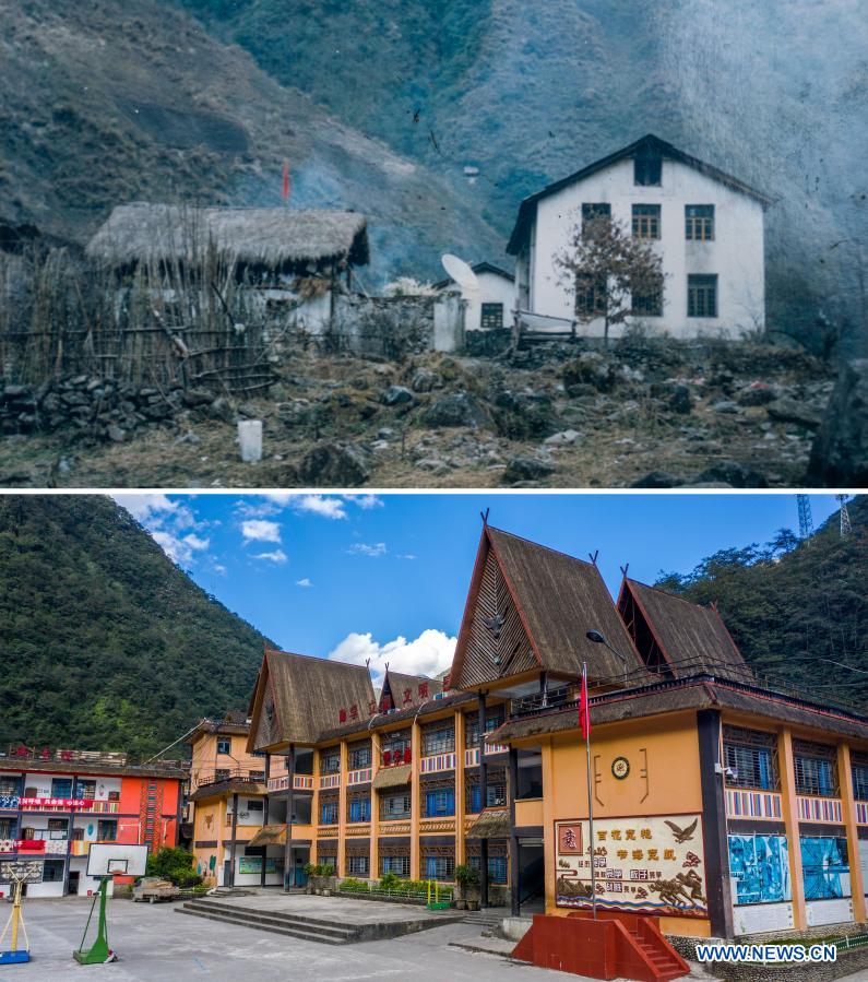 TOP: Undated file photo shows the old campus of Dulongjiang Nine-Year Comprehensive School in Dulongjiang Township of Gongshan Dulong and Nu Autonomous County, southwest China's Yunnan Province. BOTTOM: Photo taken on Oct. 31, 2020 shows the new campus of Dulongjiang Nine-Year Comprehensive School in Dulongjiang Township of Gongshan Dulong and Nu Autonomous County, southwest China's Yunnan Province. (Photo taken by Hu Chao) Dulong is a mountain-dwelling ethnic group in southwest China. It is one of the least populous of China's 56 minority nationalities. It is also called a "direct-transition" minority ethnic group because the Dulong people didn't bid farewell to primitive life until the founding of the People's Republic of China in 1949 and since then they directly stepped into the socialist society. Most Dulong people live in Dulongjiang Township, where an inhospitable mountainous terrain had been thwarting the town's development for decades. Thus, the township had been one of the poorest area in Yunnan Province and even in the entire country. But the local economic and social development has been fast-tracked in recent years when many difficulties that bottlenecked the development were eliminated thanks to state and provincial efforts. For example, the town built better infrastructure, developed specialized industries and enrolled high-quality talents. In 2018, the Dulong ethnic group shook off poverty as a whole, a phenomenal breakthrough. Nowadays, all of the 1,100-plus households in Dulongjiang have moved into new, better residences. Many residents are now engaged in herbal planting and poultry husbandry with local characteristics. All of the six administrative villages have access to roads with hard surfaces and signals of radio and TV, and are all covered by the 4G network. All villagers benefit from a critical illness insurance program. Meanwhile, the youngsters are entitled to 14 years of free education which lasts from pre-school classes to high school education. The rate of primary school attendance and that of enrollment into schools for higher levels have both remained 100 percent. Nowadays, Dulongjiang is no longer the isolated, conservative and backward region it used to be. The Dulong people here are embracing modern life at a faster pace and are keeping pace with the outside world. (Xinhua)