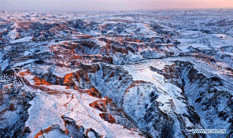 Aerial photo taken on Dec. 3, 2020 shows a view of the Mahuangliang Loess Geopark after snow in Yulin City, northwest China's Shaanxi Province. (Xinhua/Tao Ming)