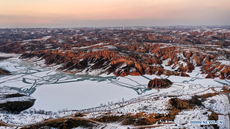 Aerial photo taken on Dec. 3, 2020 shows a view of the Mahuangliang Loess Geopark after snow in Yulin City, northwest China's Shaanxi Province. (Xinhua/Tao Ming)