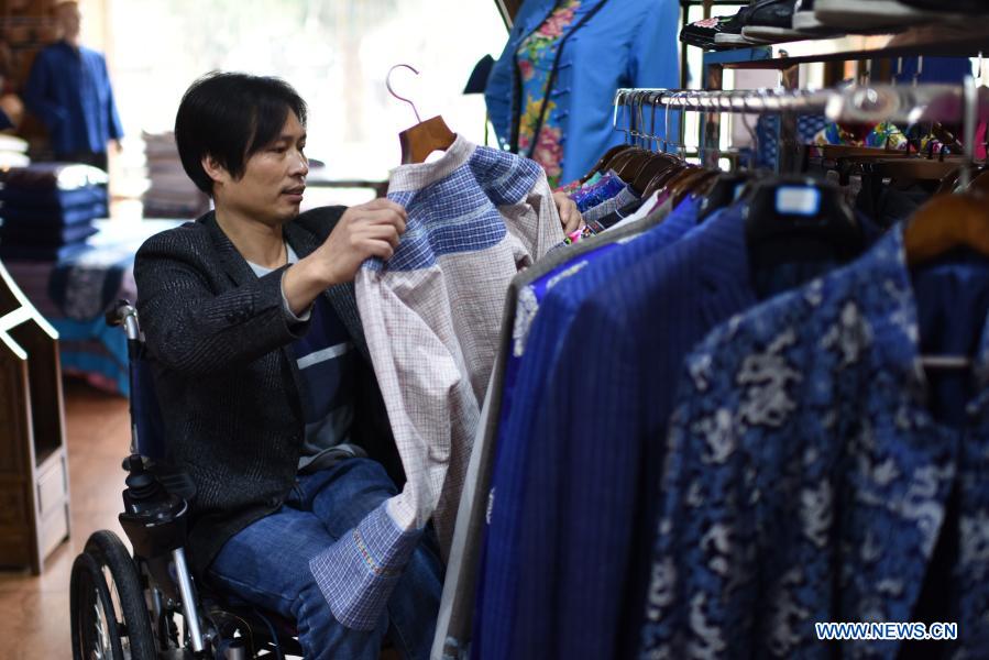 Yang Guangrong, who has disabilities in feet, works at a Miao-ethnic-group embroidery company in Songtao Miao Autonomous County in Tongren City, southwest China's Guizhou Province, Dec. 6, 2020. All 488,000 registered impoverished disabled people in Guizhou had been lifted out of poverty, data from provincial disabled persons' federation showed recently. (Photo by Long Yuanbin/Xinhua)