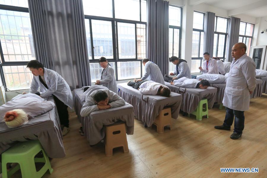 Trainees attend a skill training course at a school for blind persons in Qixingguan District of Bijie City, southwest China's Guizhou Province, Oct. 13, 2020. All 488,000 registered impoverished disabled people in Guizhou had been lifted out of poverty, data from provincial disabled persons' federation showed recently. (Photo by Wang Chunliang/Xinhua)