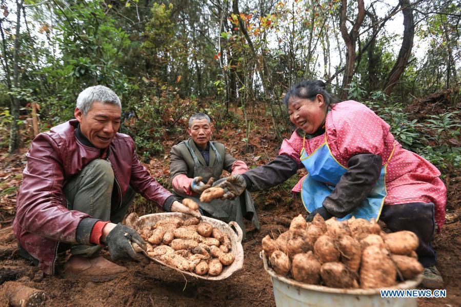 Wu Daoyuan (L), who has a disability in left leg, collects gastrodia elata with villagers at Qixingguan District of Bijie City, southwest China's Guizhou Province, Dec. 3, 2020. All 488,000 registered impoverished disabled people in Guizhou had been lifted out of poverty, data from provincial disabled persons' federation showed recently. (Photo by Wang Chunliang/Xinhua)