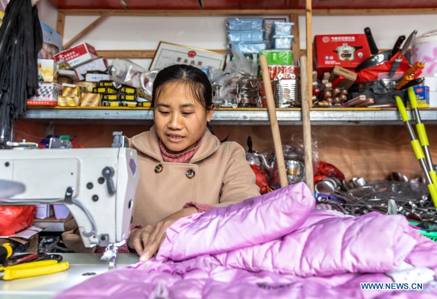 Li Wenrong, who has disabilities in two legs, sews clothes for customers at her own hardware store founded in 2018 with support of local poverty alleviation policies, at a resettlement area for relocated impoverished people in Qianxi County of Bijie City, southwest China's Guizhou Province, Dec. 6, 2020. All 488,000 registered impoverished disabled people in Guizhou had been lifted out of poverty, data from provincial disabled persons' federation showed recently. (Photo by Fan Hui/Xinhua)