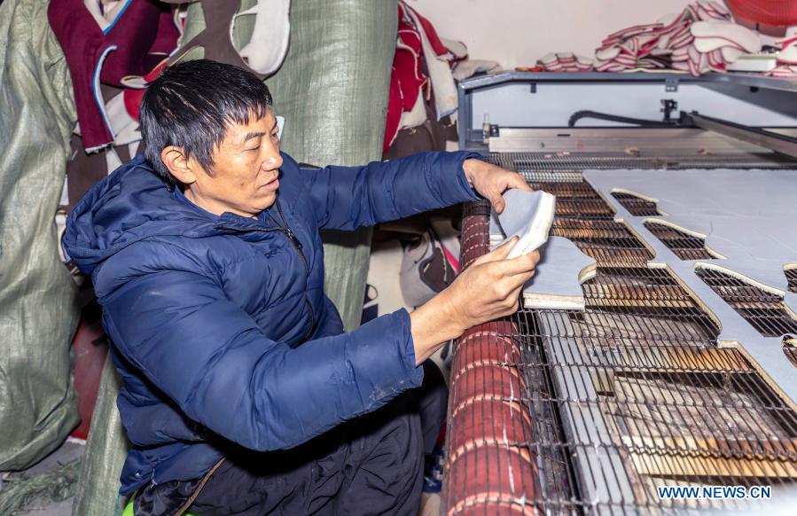 Diao Chaogui, who has disabilities in two legs, makes shoe uppers at his own cotton shoes factory founded in 2017 with local preferential loan specially for impoverished people, in Qianxi County of Bijie City, southwest China's Guizhou Province, Dec. 6, 2020. All 488,000 registered impoverished disabled people in Guizhou had been lifted out of poverty, data from provincial disabled persons' federation showed recently. (Photo by Fan Hui/Xinhua)