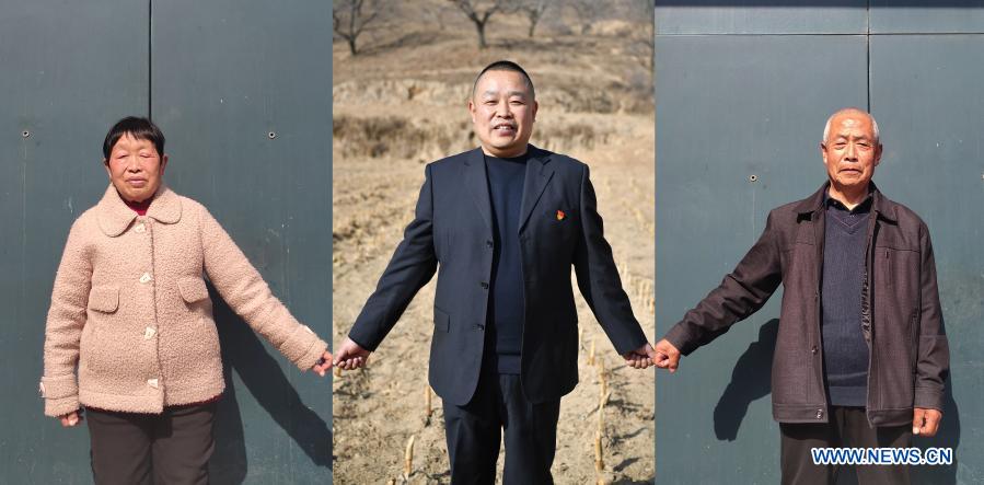 Combo photo shows Ju Wenxue in Luojiahe Village in Baota District of Yan'an, northwest China's Shaanxi Province, Feb. 10, 2021 (C, photo taken by Shao Rui) and his father Ju Enkuan (R) and mother Li Jinhua (L) at the door of their house in Linfen, north China's Shanxi Province, Feb. 12, 2021. Ju Wenxue, 42, serves as the first secretary to Luojiahe Village of of Yan'an City. This year he chose to stay put at his position during the Spring Festival. As a part of the preventative measures against COVID-19, China has encouraged people to stay locally for the Chinese New Year. Many Chinese chose not to go back to their hometowns for family gatherings, opting instead to stay where they were for the most important holiday of the year. Xinhua reporters helped those who didn't go back to their hometowns "reunite" with their families in pictures. (Xinhua)