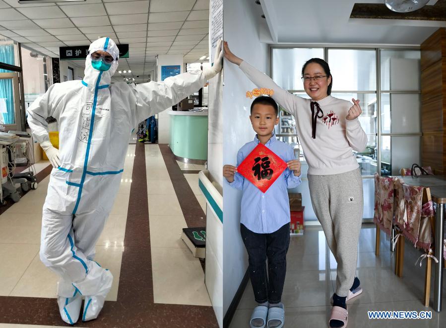 Combo photo shows Si Daoyuan in the ICU of the Tonghua Central Hospital in Tonghua, northeast China's Jilin Province, Feb. 8, 2021 (L), and his wife Ni Lujia and their son Si Tongxun at their home in Changchun, northeast China's Jilin Province, Feb. 9, 2021 (R, photo taken by Yan Linyun). Si Daoyuan, 37, is an internist in the China-Japan Union Hospital of Jilin University. He arrived in Tonghua in January with a medical support team dispatched from his hospital to fight against COVID-19, and now works in the ICU of the Tonghua Central Hospital. He chose to work in the front line of the COVID-19 epidemic control during this Spring Festival with a strong faith that a reunion with family will not be far away. As a part of the preventative measures against COVID-19, China has encouraged people to stay locally for the Chinese New Year. Many Chinese chose not to go back to their hometowns for family gatherings, opting instead to stay where they were for the most important holiday of the year. Xinhua reporters helped those who didn't go back to their hometowns "reunite" with their families in pictures. (Xinhua)