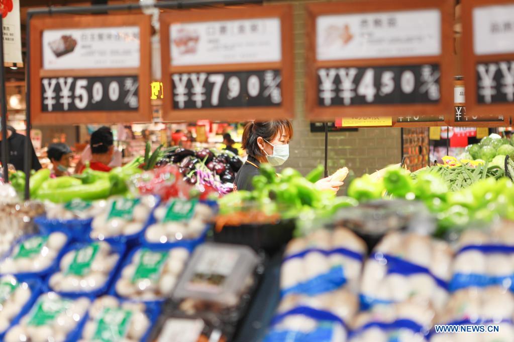 A staff member arranges products at a supermarket in Handan City, north China's Hebei Province, June 9, 2021. China's consumer price index (CPI), a main gauge of inflation, rose 1.3 percent year on year in May, data from the National Bureau of Statistics showed Wednesday. (Photo by Li Hao/Xinhua)