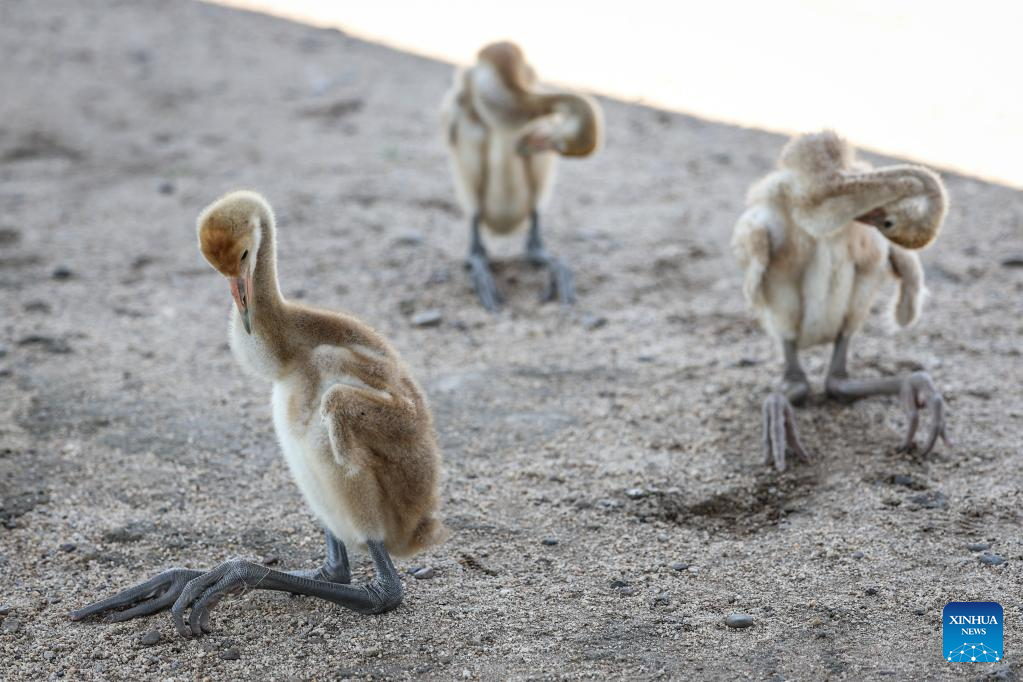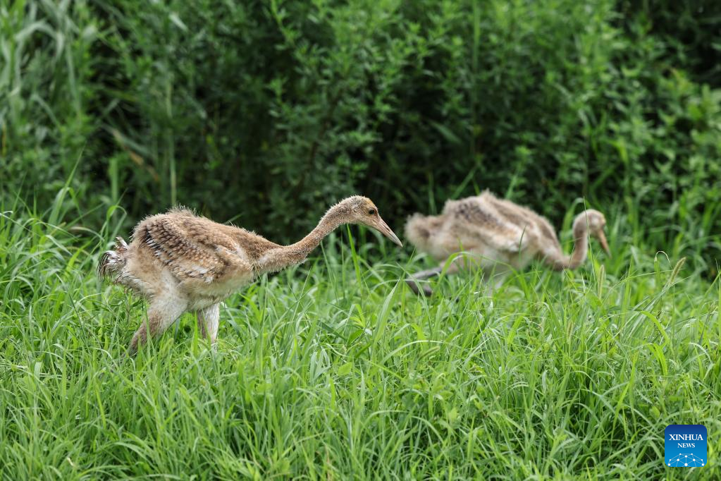 Baby red-crowned cranes are pictured in a crane breeding and protection station under the Forestry and Wetland Protection Service Center in Panjin City, northeast China's Liaoning Province, July 13, 2022.