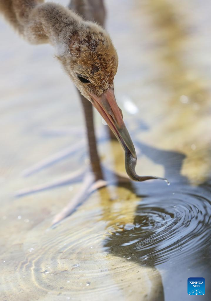A baby red-crowned crane forages in water in a crane breeding and protection station under the Forestry and Wetland Protection Service Center in Panjin City, northeast China's Liaoning Province, July 14, 2022.