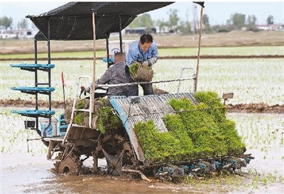 Farmers plant rice seedlings in a field in Zhaojun town, Dalate Banner in north China's Inner Mongolia Autonomous Region. Rice planting is currently underway on 38,000 mu of fields transformed from saline-alkaline land in Dalate Banner. (Xinhua/Liu Lei)