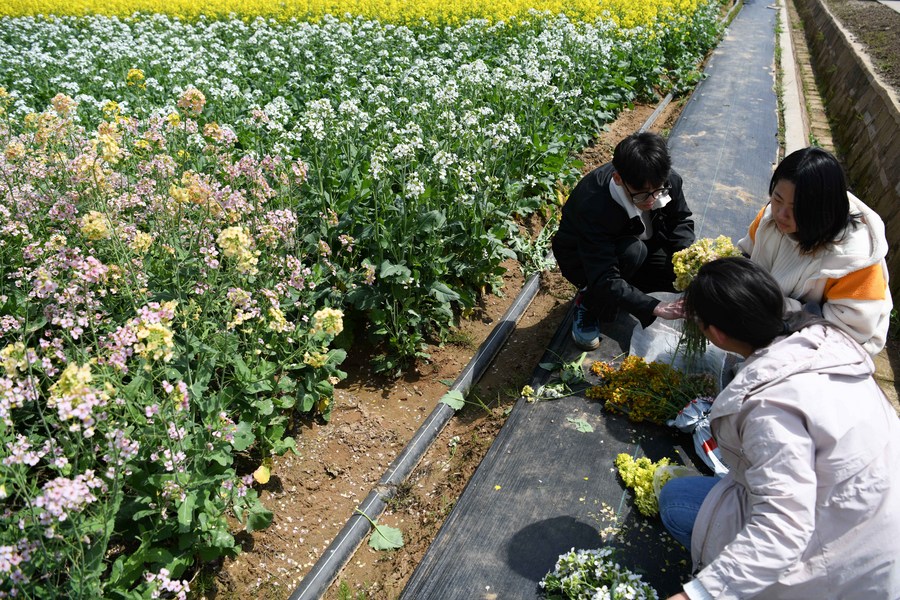 Students of Anhui Agricultural University collect cole samplings at an agricultural experimental base in Hefei, east China's Anhui Province, March 26, 2023. (Xinhua/Zhang Duan)