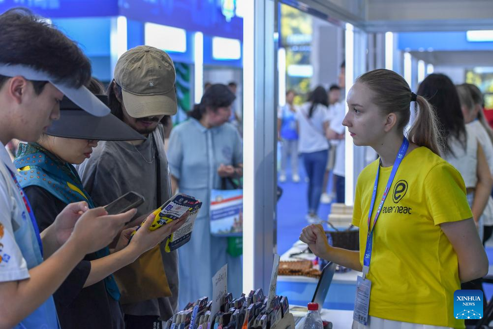 A Russian exhibitor introduces products to visitors during the 14th China-Northeast Asia Expo in Changchun, northeast China's Jilin Province, Aug. 23, 2023. The five-day event, which kicked off here on Wednesday and scheduled both online and offline, has attracted more than 1,000 companies from home and abroad, with a predominant representation from countries in Northeast Asia. (Xinhua/Zhang Nan)
