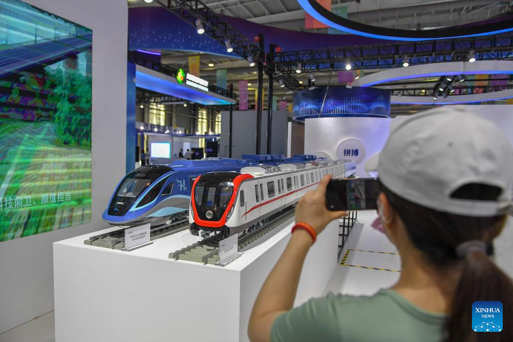 A visitor takes photos of train models displayed by CRRC during the 14th China-Northeast Asia Expo in Changchun, northeast China's Jilin Province, Aug. 23, 2023. The five-day event, which kicked off here on Wednesday and scheduled both online and offline, has attracted more than 1,000 companies from home and abroad, with a predominant representation from countries in Northeast Asia. (Xinhua/Zhang Nan)