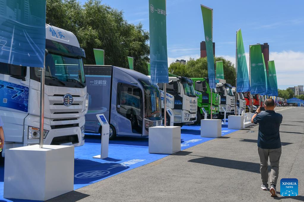 A visitor takes photos of new-energy vehicles displayed by FAW Jiefang during the 14th China-Northeast Asia Expo in Changchun, northeast China's Jilin Province, Aug. 23, 2023. The five-day event, which kicked off here on Wednesday and scheduled both online and offline, has attracted more than 1,000 companies from home and abroad, with a predominant representation from countries in Northeast Asia. (Xinhua/Zhang Nan)