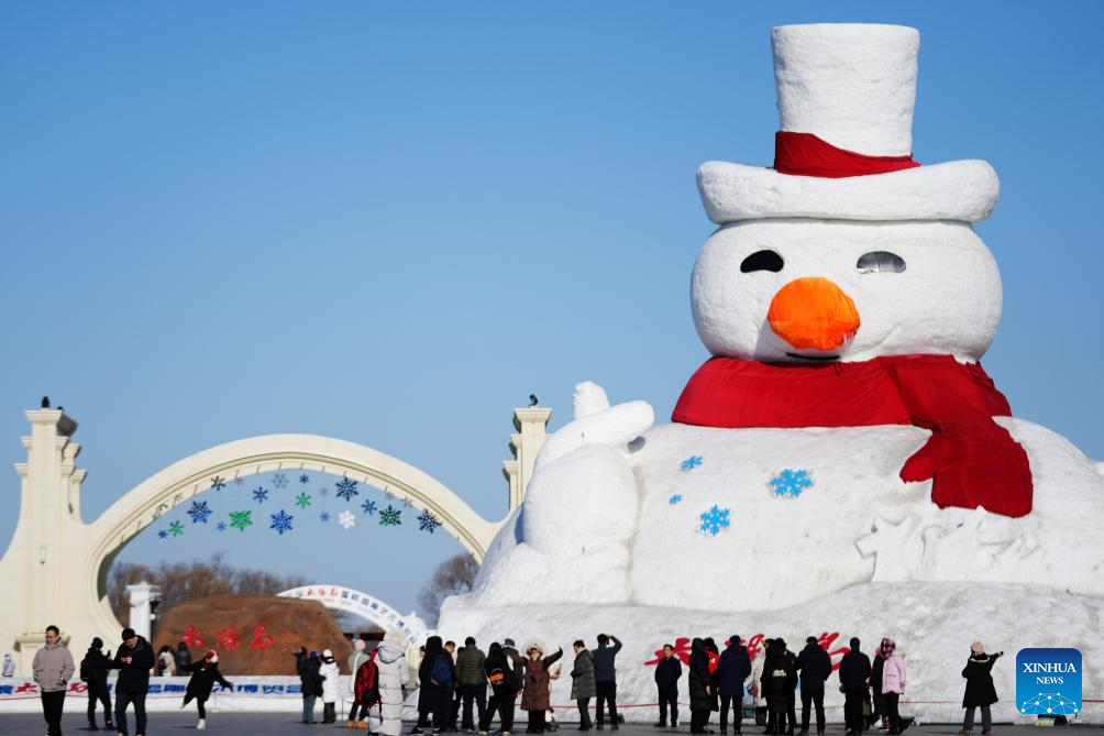Tourists play at the Sun Island scenic spot in Harbin, northeast China's Heilongjiang Province, Feb. 26, 2024. The Snow Sculpture Art Expo park of the Sun Island scenic spot closed on Feb. 26 with the rising of temperature. (Xinhua/Wang Jianwei)
