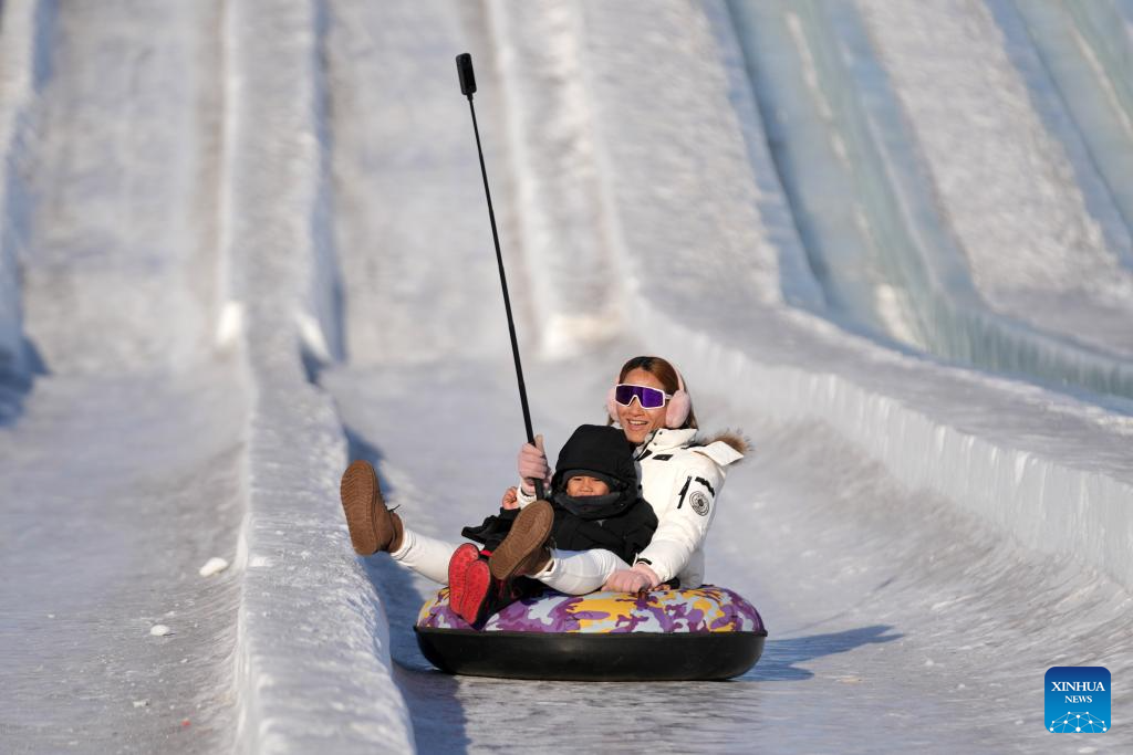 People enjoy an ice slide at the Sun Island scenic spot in Harbin, northeast China's Heilongjiang Province, Feb. 26, 2024. The Snow Sculpture Art Expo park of the Sun Island scenic spot closed on Feb. 26 with the rising of temperature. (Xinhua/Wang Jianwei)