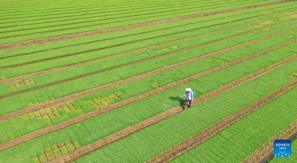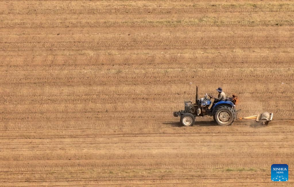 An aerial drone photo taken on April 19, 2024 shows a farmer working in a sorghum field in Xiaozhaozhuang Township of Cangzhou, north China's Hebei Province. Friday marks Guyu, or Grain Rain, which is the sixth of the 24 traditional Chinese solar terms, signifying the onset of the rainy season, a favorable time for planting and the growth of crops. (Photo by Zhou Yang/Xinhua)