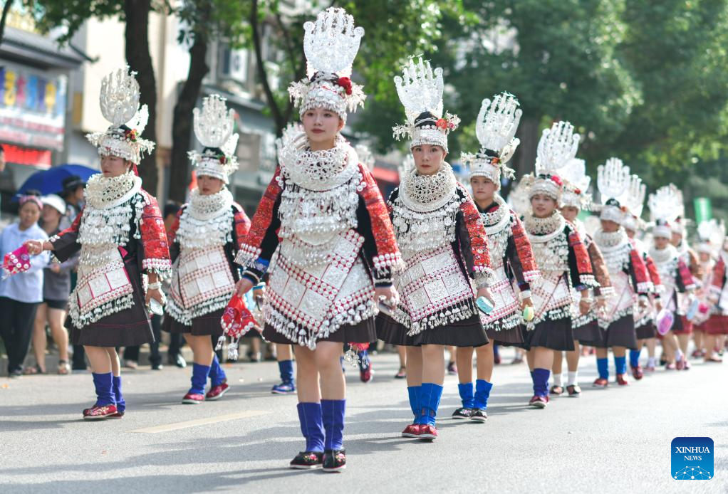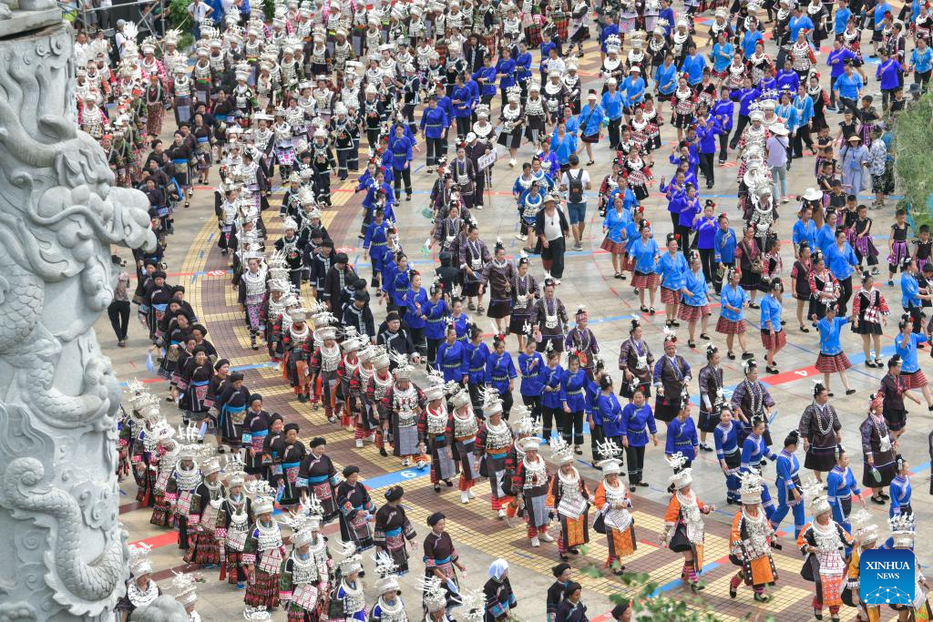 People take part in the celebration of "Liuyueliu", an ethnic festival, in Jianhe County of Qiandongnan Miao and Dong Autonomous Prefecture, southwest China's Guizhou Province, July 13, 2024. The annual celebration of the ethnic festival "Liuyueliu" lasts from July 11 to 14 here in Jianhe County. A series of cultural activities have been held during the celebration. (Xinhua/Yang Wenbin)