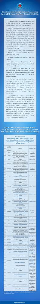 The National Immigration Administration (NIA) announced today that it will fully relax and optimize the visa-free transit policy, which is effective immediately. The stay duration for foreign nationals eligible for visa-free transit has been extended from the previous 72 hours and 144 hours to 240 hours (10 days). Additionally, 21 ports of entry and exit have been added for visa-free transit individuals, further expanding the allowed areas for visa-free transit travelers. Individuals from 54 eligible countries, including Russia, Brazil, the United Kingdom, the United States of America, and Canada, traveling from China to a third country (region), can enter visa-free through any of the 60 open ports in 24 provinces (autonomous regions and municipalities), and stay within the allowed areas for visa-free transit travelers for no more than 240 hours.