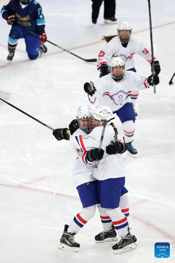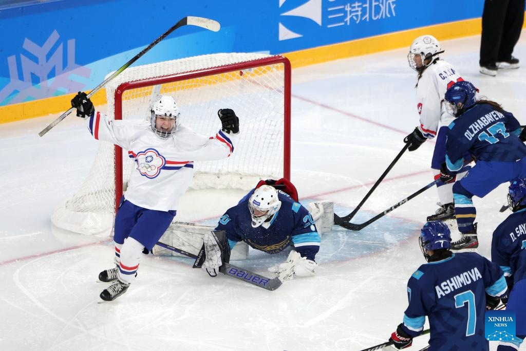 Wu Ji-Cih (1st R) of Chinese Taipei celebrates a goal during the women's ice hockey group B match between Chinese Taipei and Kazakhstan at 2025 Asian Winter Games in Harbin, northeast China's Heilongjiang Province, on Feb. 6, 2025. (Xinhua/Sun Fei)