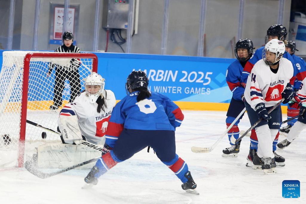 Goalie of Thailand, Thamida Kunthadapakorn (2nd L) competes during the women's ice hockey group B match between South Korea and Thailand at 2025 Asian Winter Games in Harbin, northeast China's Heilongjiang Province, on Feb. 6, 2025 (Xinhua/Chen Bin)