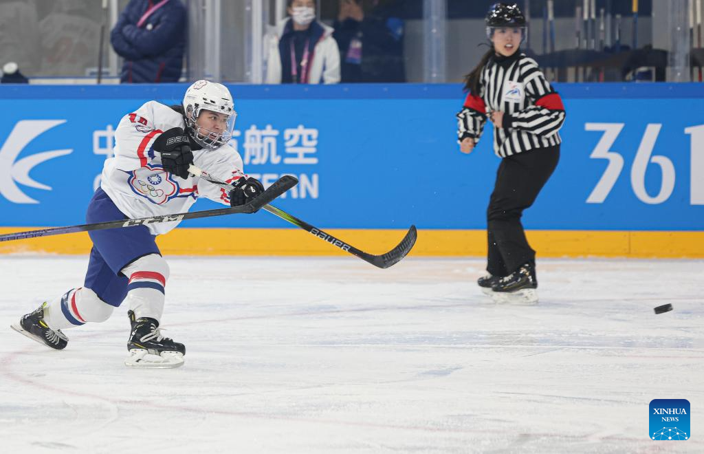 Huang Min-Chuan (2nd R) of Chinese Taipei competes during the women's ice hockey group B match between Kazakhstan and Chinese Taipei at 2025 Asian Winter Games in Harbin, northeast China's Heilongjiang Province, on Feb. 6, 2025. (Xinhua/Hu Xingyu)