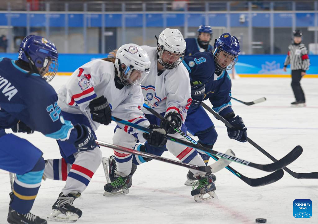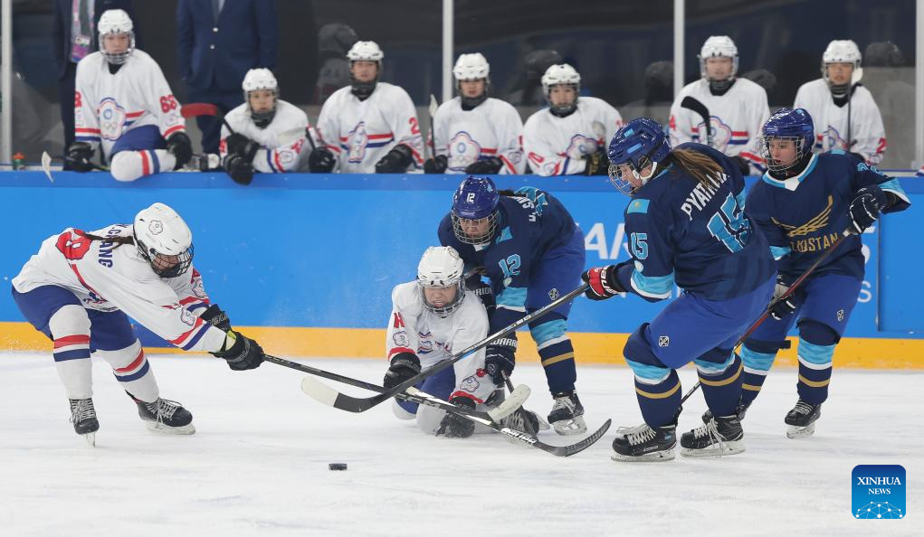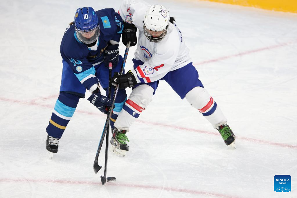 Chang En-Wei (back R) of Chinese Taipei vies with Malika Aldabergenova (back L) of Kazakhstan during the women's ice hockey group B match between Chinese Taipei and Kazakhstan at 2025 Asian Winter Games in Harbin, northeast China's Heilongjiang Province, on Feb. 6, 2025. (Xinhua/Chen Bin)