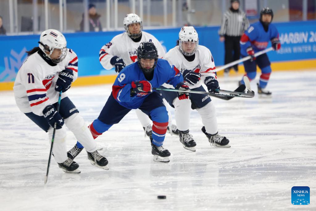Kim Selin (3rd L) of South Korea vies with Suwipa Panyamaneerat (2nd L) of Thailand during the women's ice hockey group B match between South Korea and Thailand at 2025 Asian Winter Games in Harbin, northeast China's Heilongjiang Province, on Feb. 6, 2025 (Xinhua/Chen Bin)