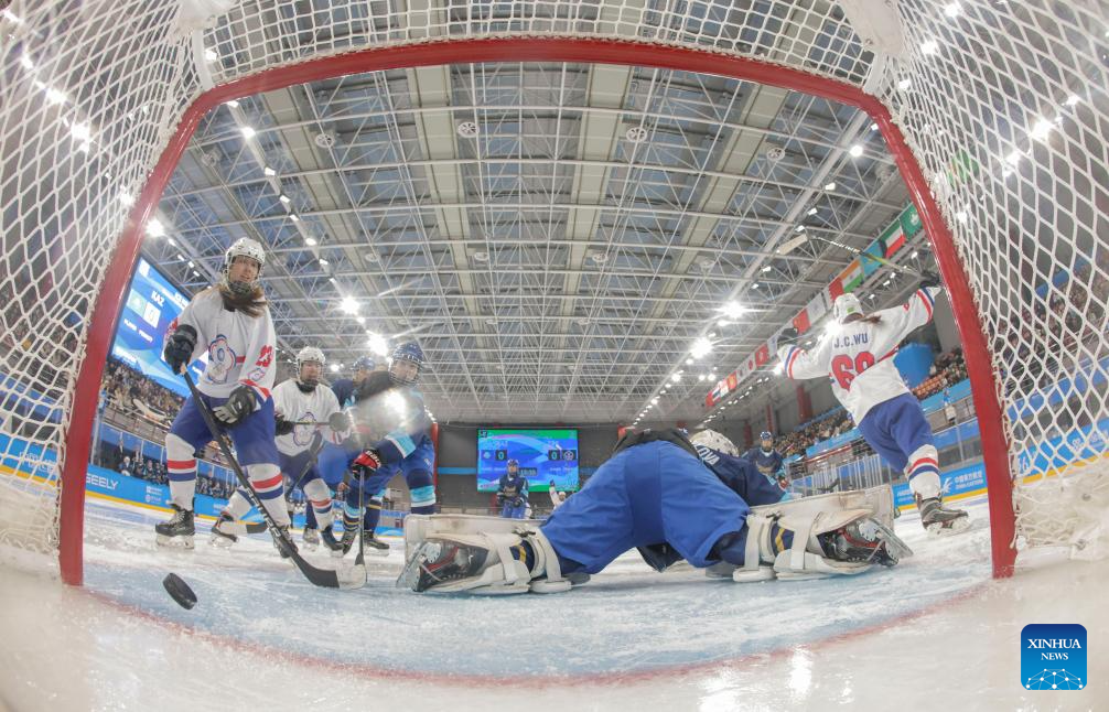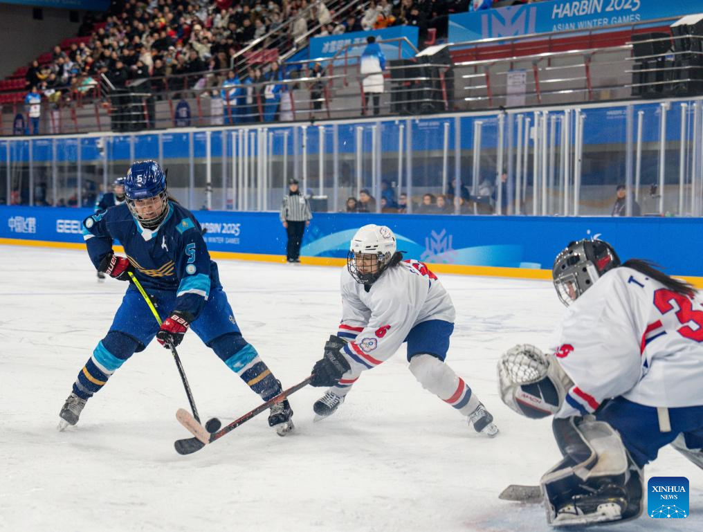 Wu Ji-Cih (1st L) of Chinese Taipei shoots to score during the women's ice hockey group B match between Chinese Taipei and Kazakhstan at 2025 Asian Winter Games in Harbin, northeast China's Heilongjiang Province, on Feb. 6, 2025. (Xinhua/Chen Bin)