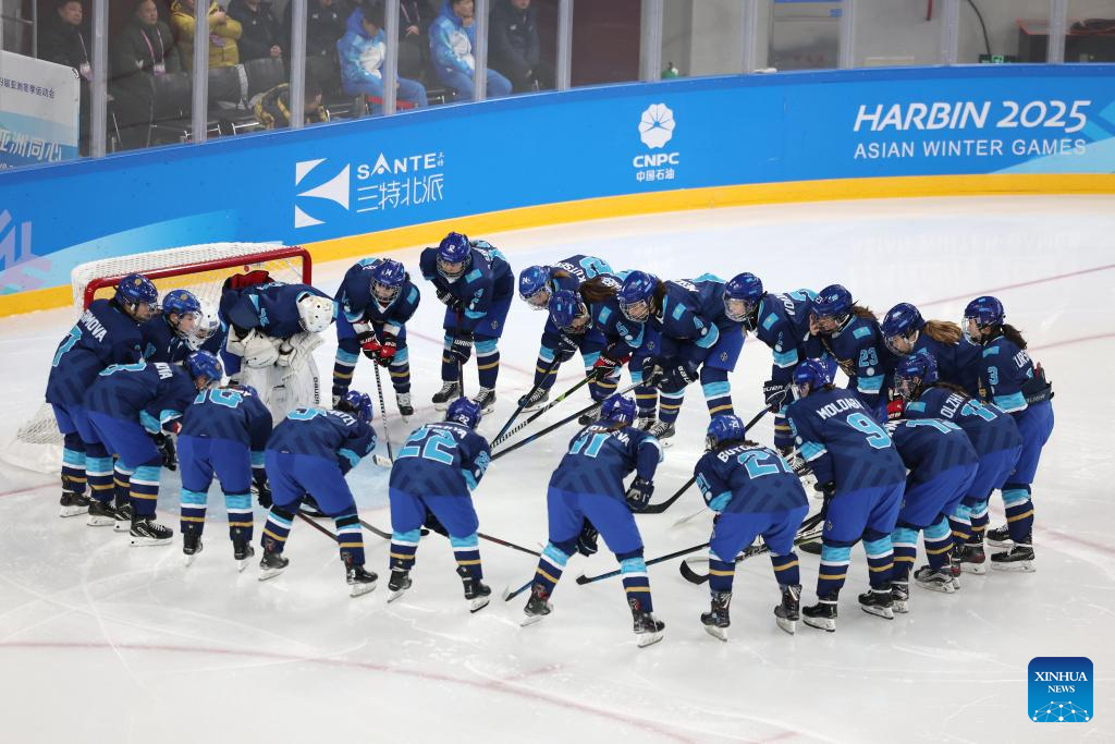 Players of Kazakhstan cheer up before the women's ice hockey group B match between Chinese Taipei and Kazakhstan at 2025 Asian Winter Games in Harbin, northeast China's Heilongjiang Province, on Feb. 6, 2025. (Xinhua/Chen Bin)