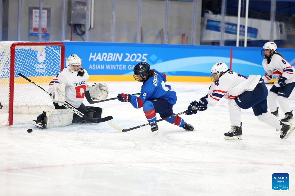 Park Jongah (2nd L) of South Korea tries to score during the women's ice hockey group B match between South Korea and Thailand at 2025 Asian Winter Games in Harbin, northeast China's Heilongjiang Province, on Feb. 6, 2025 (Xinhua/Chen Bin)