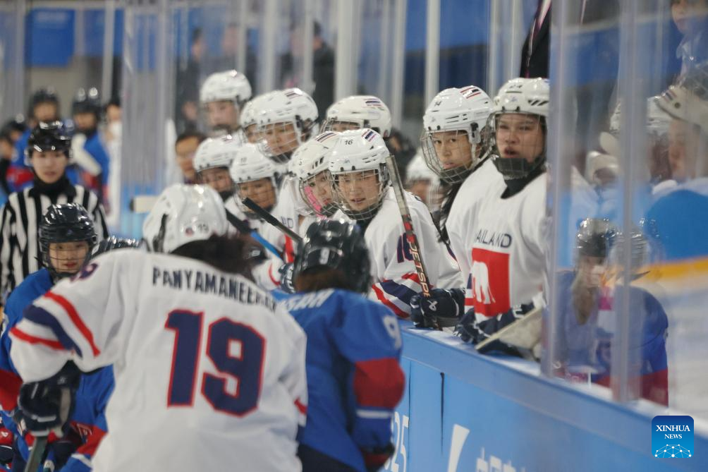 Substitutes of Thailand cheer up for teammates during the women's ice hockey group B match between South Korea and Thailand at 2025 Asian Winter Games in Harbin, northeast China's Heilongjiang Province, on Feb. 6, 2025 (Xinhua/Chen Bin)