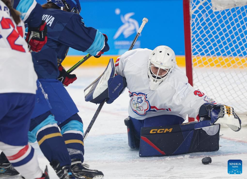 Sofiya Zubkova (L) of Kazakhstan shoots during the women's ice hockey group B match between Kazakhstan and Chinese Taipei at 2025 Asian Winter Games in Harbin, northeast China's Heilongjiang Province, on Feb. 6, 2025. (Xinhua/Hu Xingyu)