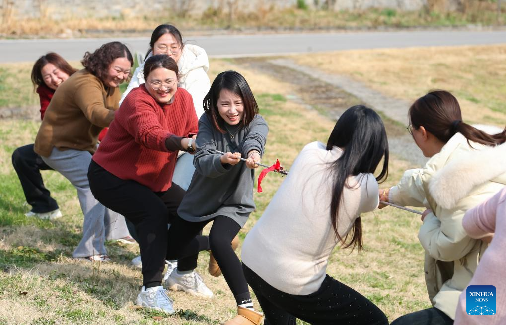 Women compete in a tug-of-war game during an event celebrating the International Women's Day in Jurong City, east China's Jiangsu Province, March 6, 2025. Various activities are held across the country to mark the International Women's Day. (Photo by Zhong Xueman/Xinhua)