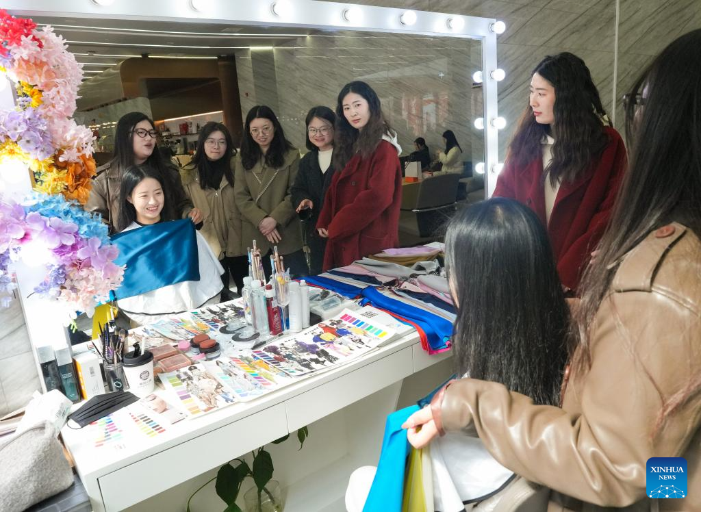 Women attend a make-up class in Huzhou City, east China's Zhejiang Province, March 6, 2025. Various activities are held across the country to mark the International Women's Day. (Xinhua/Weng Xinyang)